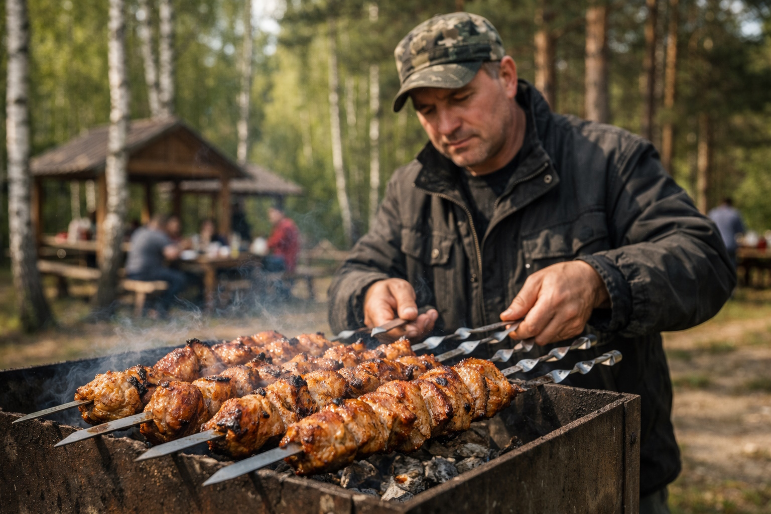 Когда угли готовы и покрылись легким белым налетом, пора приступать к жарке. Расстояние между мясом и жаром должно составлять примерно 10–15 сантиметров. Постоянное вращение шампуров гарантирует равномерную прожарку и сохранение сока внутри каждого кусочка. Если вы готовите овощи, насаживайте их на отдельные шампуры, так как баклажаны, перец и томаты готовятся гораздо быстрее мяса.